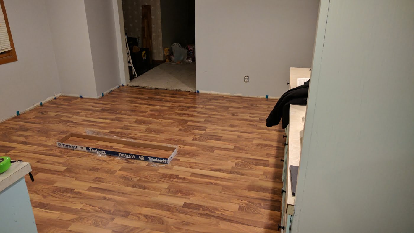Tonight was flooring day #2. I initially had the help of my father-in-law and then my buddy Jon Kay arrived to give a hand. We wrapped things up at about 11pm and got just into the kitchen. We got all the underlayment in the kitchen set but there will be some initial crazy cutting required. The kitchen is smaller so hopefully it doesn’t go so bad. Once the kitchen is complete then appliances can be moved in, and the hallway can be completed. We’ll see how the rest of everything goes. So thankful for the help we’ve had getting things ready.