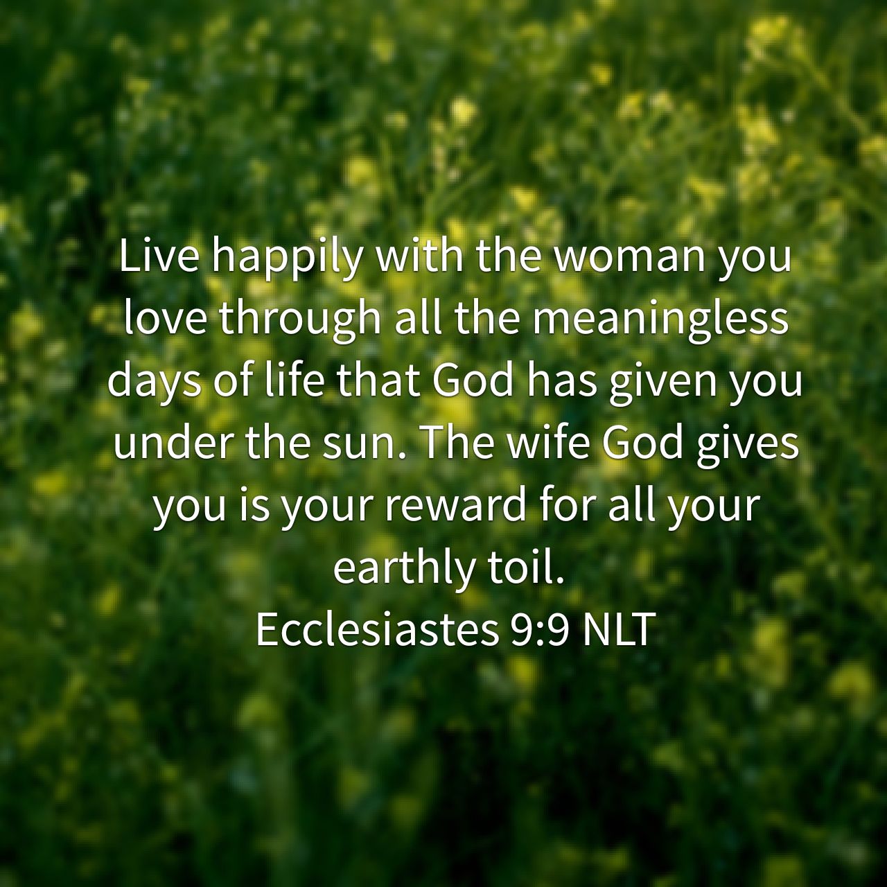Live happily with the woman you love through all the meaningless days of life that God has given you under the sun. The wife God gives you is your reward for all your earthly toil. – Ecclesiastes 9:9 NLT