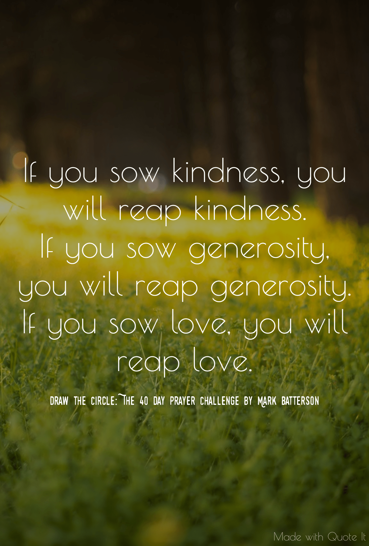 “If you sow kindness, you will reap kindness. If you sow generosity, you will reap generosity. If you sow love, you will reap love.” – Draw the Circle: The 40 Day Prayer Challenge by Mark Batterson